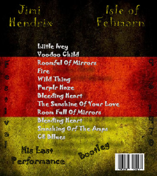Todays first download is a bootleg by the legendary Jimi Hendrix which was recorded at the Isle Of Fehmarn Festival, Germany on September 6th 1970. This was Jimi's last ever live show before his death on September 18th 1970 and is the best quality Jimi Hendrix boot I've heard. For a bootleg thats over 40 years old the quality of this boot is outstanding. If you like the legend that is JH - this is a must have.... a great bootleg - thoroughly recommended...... Here is a download link I found for :- Live at the Isle Of Fehmarn Festival, Germany 6.9.70 - Jimi Hendrix (Bootleg) Quality : Superb Tracklisting : 01. Little Ivey Download Link : [Link] Filesize : 150MB (Including Artwortk) Back Cover : [Link] Enjoy!