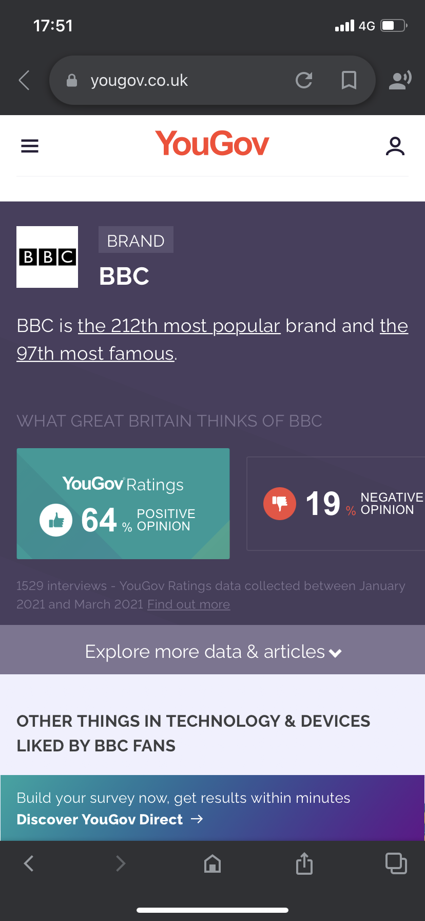 WOW, hardly a compelling argument for the UK, is it or your defence. Shall we agree to disagree or do you want to back yourself into a corner you cant get out of. I'll wait. Edit I ve seen you're resorting to insults. Heyho Edited by eagleman13 (23 May 2021 6.02pm) I’ve literally shown you a YouGov poll showing 64% support for the BBC v 19% against. What more do you want?