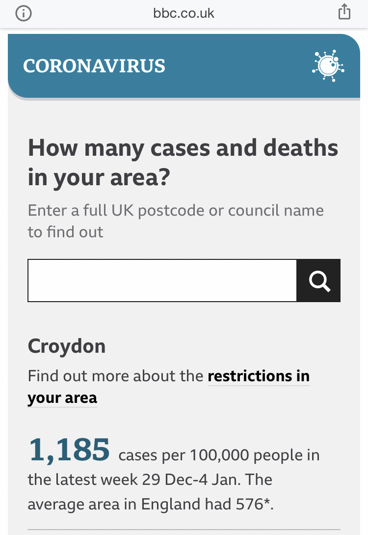 When I look on the bbc website [Link] I cannot find where the government get 1 in 20 in Croydon are infected. They said this a few days ago but; week up to 4th January it was 1,185 per 100,000. week up to 6th January it was 1,065 per 100,000. That’s 1 in 100 people, not 1 in 20. You could assume higher infections in spring 2020 without the tests, but now? And the stats people estimated ten times more than was known about. It also fell, as do snippets of information about all or most of London tell us.