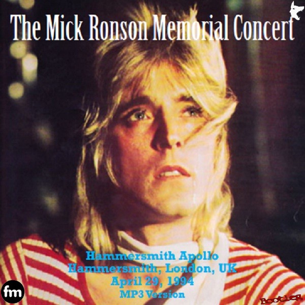 Todays first download is a tribute to guitarist Mick Ronson that was recorded one year after he died at the Hammersmith Apollo 1994. Mick died of liver cancer on 29th April 1993 at the age of 46. Among those performing were long-time musical partner Ian Hunter, The Spiders From Mars (alongside Mick Ronson, they were David Bowie’s backing band in the early ’70s), Joe Elliott and Phil Collen (Def Leppard), Roger Taylor (Queen), Roger Daltrey (The Who), Bill Nelson (Be Bop DeLuxe), Willy And The Poor Boys (Gary Brooker, Andy Fairweather-Low, Bill Wyman), and many others. The show was broadcast on BBC Radio 1 on the 30th April 1994. Mick was named the 64th greatest guitarist of all time by Rolling Stone in 2003 and 41st in 2012 by the same magazine. This is a cracking show and this is thoroughly recommended... Here is a download link I found for :- The Mick Ronson Memorial Concert, Live at the Hammersmith Apollo, Hammersmith, London, UK 29.4.94 - Various Artists (Bootleg) Quality : Superb Tracklisting : Disc 1: Disc 2 : Download Link : Disc 1 : [Link] Disc 2 : [Link] Filesize : 251MB (Including Artwork) Enjoy!