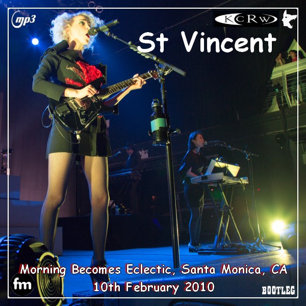 Todays extra download is a set by St Vincent that was recorded at the KCRW-FM Studios, Santa Monica, CA on the 10th February 2010. This is in superb quality and the audio for the show has been taken from an FM broadcast of the show and it sounds top notch. I've posted four bootlegs by St Vincent this year already - all from shows they performed this year, so it was nice to see this early show by them. There is a short interview in the files but this can be easily deleted if not wanted as its a seperate track. If you've downloaded any of the shows I've posted from the festivals this year - then grab this earlier show to hear them 4 years ago... this is thoroughly recommended... Here is a download link I found for :- Live on KCRW-FM Morning Becomes Eclectic Show, Santa Monica, CA 10.2.10 - St Vincent (Bootleg) Quality : Superb Tracklisting : 01 Intro Download Link : [Link] Filesize : 57.1MB (Including Artwork and Tracklisting) Total Time: 41.28 min. Enjoy!