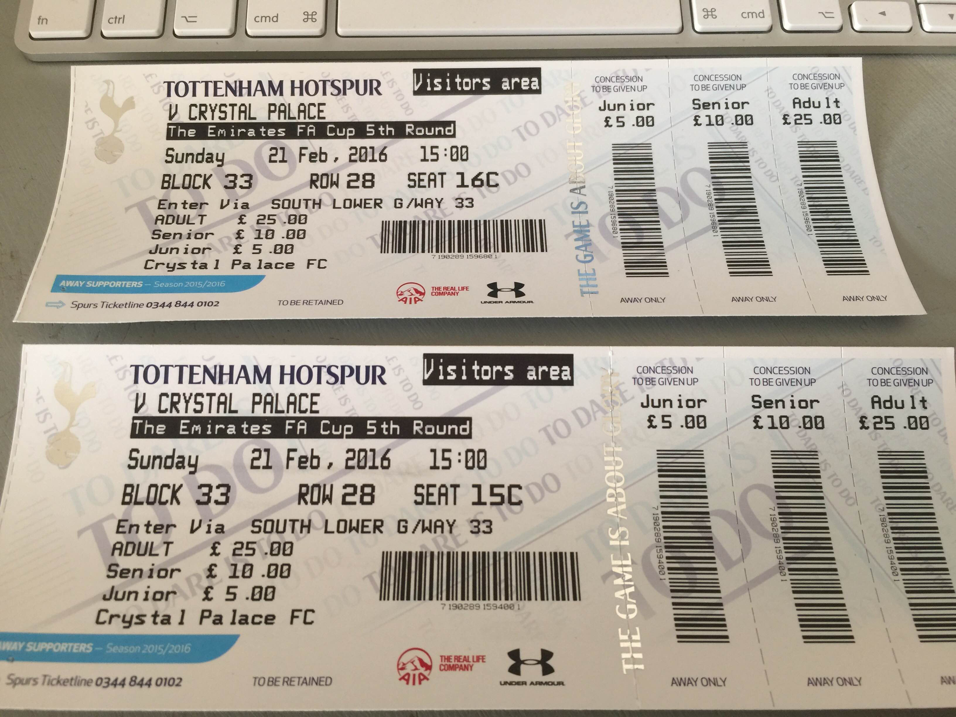 This post has been merged from a topic called '2x Spurs FA Cup tickets to sell 21st Feb 3pm KO' by Old Chap Can no longer go, gutted. Im after face value £25 each. Block 33 Row 28 seats 15/16 C collection only from se19 2rn