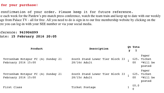This post has been merged from a topic called '2x Spurs FA Cup tickets to sell 21st Feb 3pm KO' by Old Chap screenshot of email confirmation to put anybodys mind at rest. 2x adult tickets. obviusly names been cropped off Edited by jayjaychil (18 Feb 2016 1.47pm)