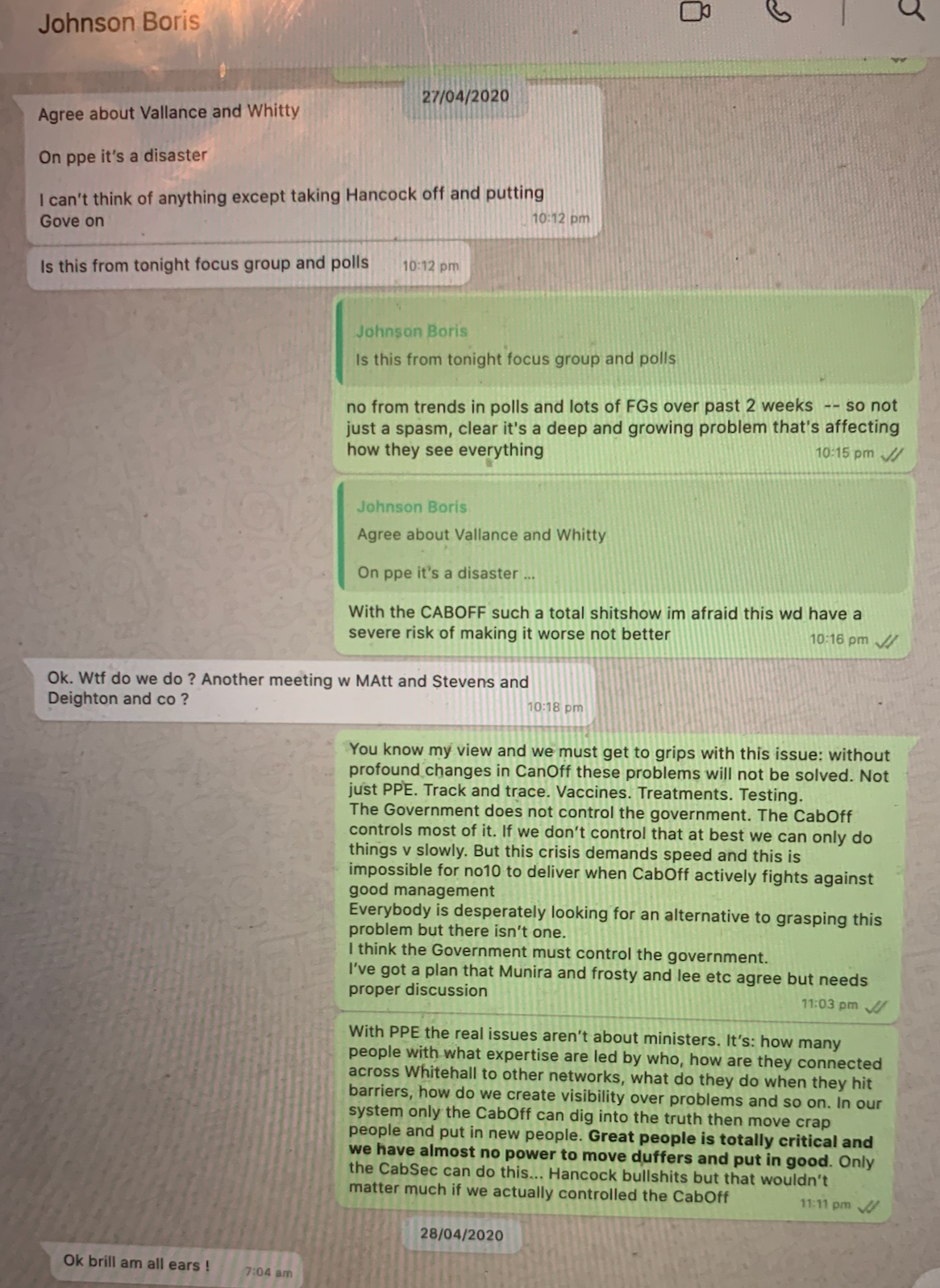 Cummings has just posted a load of info on his substack Well worth a read. Particular highlights for me... No10 and Hancock are seeking to rewrite history: D. The PM’s defence of Hancock sends an unmistakeable signal across the system: a Secretary of State will be rewarded despite repeated incompetence and dishonesty and the government machine will seek to rewrite history in Orwellian fashion because the PM thinks it in his personal interests to do so. Any decent person in Westminster ought to be appalled by this behaviour. This is why even on 18 March, a SAGE member emailed me, the Cabinet Secretary and Hancock’s Permanent Secretary saying we would look back on SAGE discussions as ‘a strange dream’ because lockdown had not even been discussed: ‘Literally all the models assume that there will be a full-blown epidemic, and its just a matter of how much it can be drawn out, compressed, or the herd immunity directed to one section or another of the population’ because thinking was based on assumptions (no test-trace, population won’t listen to tough rules, reinfection from abroad etc) and ‘Once you take these assumptions for granted, the only paths that exist are to achieve herd immunity’. But, he rightly said, suppression should be considered partly because the imminent collapse of the NHS was so horrific and because ‘prior models and assumptions are WRONG [emphasis in original]. We could do this, ie a total lockdown. We’ll look back on it like a strange dream, but we could – and should – do it.’ Also bear in mind: Hancock’s appalling prioritisation of gaming the lobby worked to a large extent 2020-1. When you will do anything for tomorrow’s papers, this earns you favours that are repaid when you fail. This sort of deep incentive problem is central to Westminster’s performance. --------- When I had a separate meeting with officials on PPE supplies, I heard the following terrible news, flatly contradicting Hancock: we won’t get most of our PPE deliveries until long after the April peak. Me: Why? Official: That’s how long it takes to ship. Me [extreme sinking feeling]: What do you mean ‘ship’, surely we’re flying everything now? Official: No, that’s against the [procurement] rules, we ship everything because it’s much cheaper. Me (close to the most angry/appalled I was in 18 months): After this meeting, call the airlines, tell them we’re hiring their planes, their entire business is dead so you’ll be able to get a great deal, get officials figuring out where the nearest airfields are in China to the factories with our stuff, then fly the planes to those airfields, collect our stuff, fly it back, and tell everybody we’re flying stuff in an emergency not shipping it… Official: Umm, will you get the Private Office to put that in writing. [A standard comment in such meetings.] Me: Yes the PM will take full legal responsibility. ------