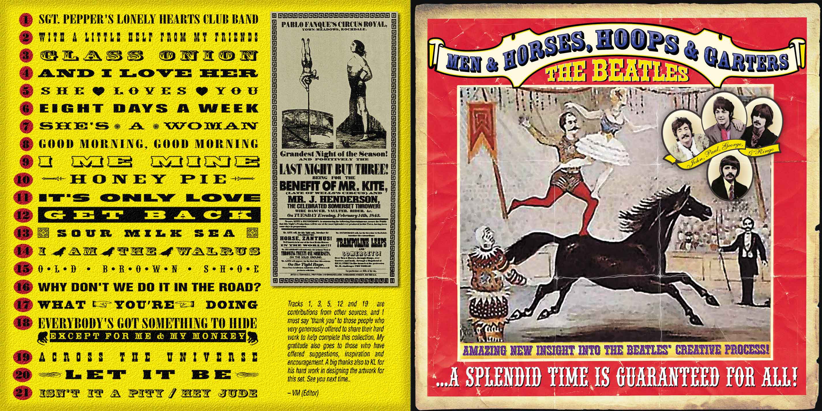 01 Sgt Peppers Lonely Hearts Club Band 02 With A Little Help From My Friends 03 Glass Onion 04 And I Love Her 05 She Loves You 06 Eight Days A Week 07 She's A Woman 08 Good Morning Good Morning 09 I Me Mine 10 Honey Pie 11 It's Only Love 12 Get Back 13 Sour Milk Sea 14 I Am The Walrus 15 Old Brown Shoe 16 Why Don't We Do It In The Road 17 What You're Doing 18 Everybody's Got Something To Hide 19 Across The Universe 20 Let It Be 21 Isn't It A Pity , Hey Jude 22 Her Majesty 23 King Lear Speech 24 Sour Milk Sea