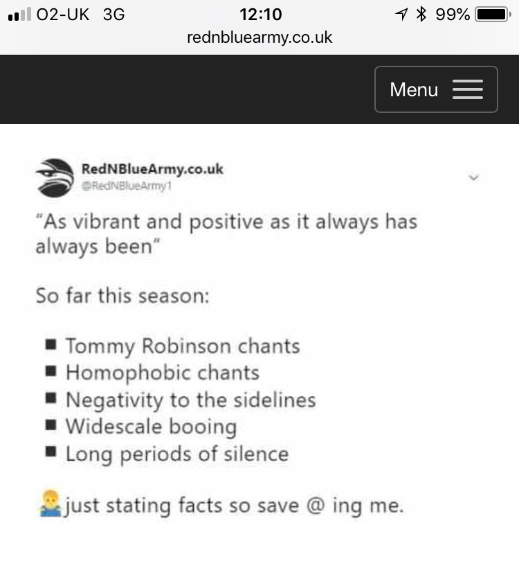 When I first saw this thread I thought it was embarrassing, now mainstream outlets are picking the story up and making the rest of us fans look like morons. Every footy fan in the country are going to have a field day with this. [Link] It is a massive fck up by everyone involved. I love what the HF did to raise the club's profile, and I contributed to their coffers on a few occasions. To say the atmosphere is now 5hlt, is probably something to do with our results so far. The HF did a fantastic display for the opening game against Huddersfield last season. At 3-0 down, even Huddersfield fans were taking the pl55 that our support was silent. Now this slanging match has hit the media, there is going to be a massive amount of pl55 taken out of us on social media,...and at Selhurst. Edited by Forest Hillbilly (04 Sep 2018 12.23pm)