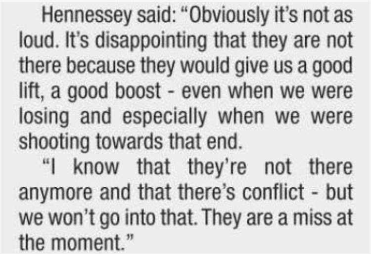 Hennessey quotes on missing the atmosphere. There’ll be more players soon. Are you saying Hennessey is 5hlt because the HF aren't there ? Next, Roy will be saying how much he misses the HF tactical input, especially for substitutions The HF were promised something on a spurious decision, that couldn't be done.