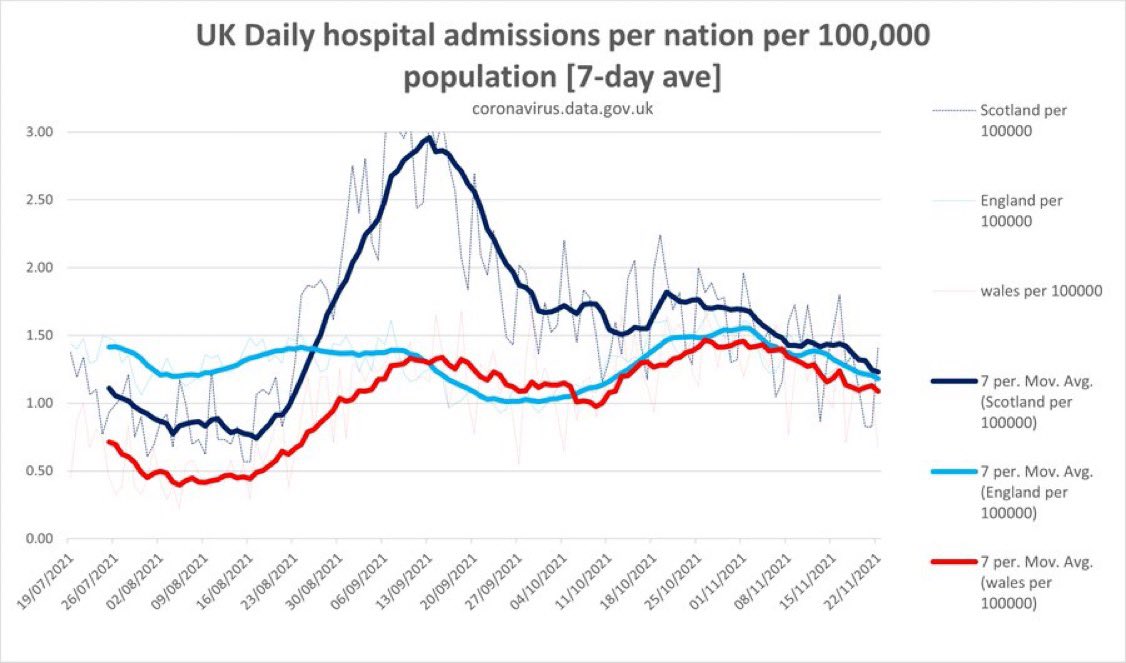That is a very arrogant response. We can disagree, as others do, but my point is that whilst there are two strands of thought on the use of face masks they have a part to play in getting people on board with the need to take precautions. My own opinion is that anything which limits the amount of virus in the air must have an impact, whether that is a mask, or changing the air. The idea that we have gone overboard just because we have had a 99% recovery rate is often trotted out by those who seek to resist the need to participate in the effort demanded of us. The real question is what would have happened if we had not collectively made that effort? The scientifically based forecasts were dire. I believe the scientists, much more than barrack-room experts. Of course, life is a risk, but you take steps to avoid those risks you can avoid. You don't walk in front of traffic just because you can. Being pedantic over terminology isn't contributing anything, especially when the correct word is actually "strain". My wife works in our local hospital. I suggest you try telling her this is being "overplayed"! When I picked her up from a 12 hour shift in A & E last night, there were around 40 ambulances waiting to offload. They are scared sh*tless of another major surge. We absolutely need to be very cautious and ALL of us play our part, irrespective of any "I know better" proclivities. Fortunately, we have a live-running experiment that shows us the effect masks and other such restrictions have on case numbers and hospital admissions. Looking at the plot I attached, If they made the slightest bit of difference, I suppose the dark blue line might be England (no masks) whilst the other two would be Scotland and Wales (masks). The data starts at the point the mask / vaccine papieren bitte polciies came into place. Unfortuntely for the narrative, the data show no such thing. The dark blue line is in fact Scotland (masks), whilst Wales (masks) and England (no masks) seem to track each other pretty well over the past 2 months. Reconcile that with your assertions on mask efficacy please. You will need to explain how, despite masks working to limit the spread, they simultaneously perform worse than no masks (Scotland) and make no difference (Wales). Edited by davenotamonkey (01 Dec 2021 12.02am)