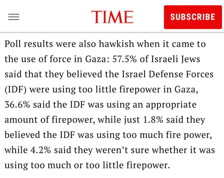 Interesting to see how public opinion in Israel is going. According to the Time article nearly 6 in 10 Israelis don't think the bloodshed we have seen in Gaza has been enough, and think the IDF has used too little firepower. Only 1.8% of Israelis said they believed the IDF has been using too much firepower. Of course, just as here, most people aren't political and respond to fear and media/state propaganda. However, it seems that the peace and love picture presented by some meets up against hard reality when sh1t gets real. This doesn't surprise me as it's human nature. The idea of a two state solution is a fantasy......It would have been 'just' but powerful forces on both sides are determined for a zero sum game. Edited by Stirlingsays (06 Dec 2023 1.16am)