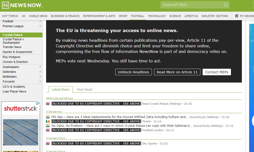 This came up for me on NewsNow, see attached. More EU interfering and restricting internet use! Essentially it's a 'link tax' and this bureaucracy will hit small media outlets while large corporations such as Google and Facebook will be able to afford it. As is the case with lots of EU regulation. More on this Copyright Directive [Link] Edited by Penge Eagle (05 Sep 2018 10.54pm) Thats bang out of order, the sooner we leave the better