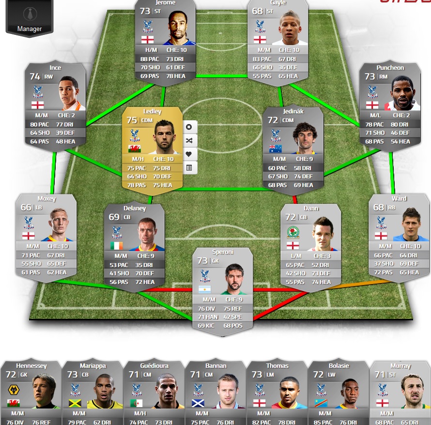 Not overly keen on that Want to see a slightly attacking line up --------------Speroni------------- Ward-------Dann----Delaney----Parr --------------Jedinak--------------- -Puncheon------Bannan--------Bolasie -----------Chamakh--Murray---------- Subs: Hennessey, Gabbidon, Ince, Guedioura, Ledley, Gayle, Jerome