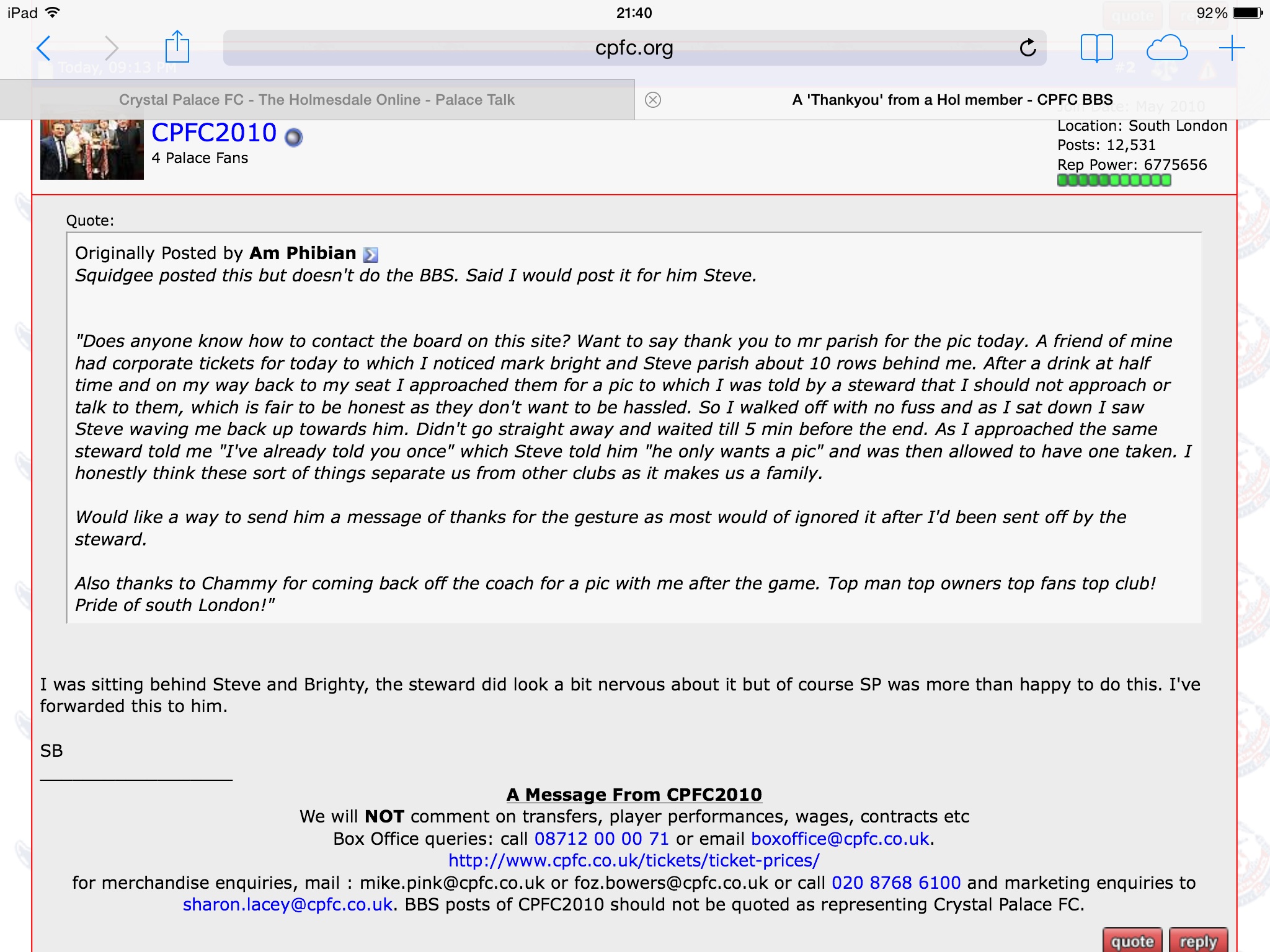 Does anyone know how to contact the board on this site? Want to say thank you to mr parish for the pic today. A friend of mine had corporate tickets for today to which I noticed mark bright and Steve parish about 10 rows behind me. After a drink at half time and on my way back to my seat I approached them for a pic to which I was told by a steward that I should not approach or talk to them, which is fair to be honest as they don't want to be hassled. So I walked off with no fuss and as I sat down I saw Steve waving me back up towards him. Didn't go straight away and waited till 5 min before the end. As I approached the same steward told me "I've already told you once" which Steve told him "he only wants a pic" and was then allowed to have one taken. I honestly think these sort of things separate us from other clubs as it makes us a family. Would like a way to send him a message of thanks for the gesture as most would of ignored it after I'd been sent off by the steward. Also thanks to Chammy for coming back off the coach for a pic with me after the game. Top man top owners top fans top club! Pride of south London!