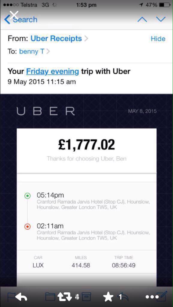 Uber sh1ts all over black cabs whose protests I find pathetic. Especially when they highlight safety concerns in their case against Uber. Cos no one ever got raped or robbed in a black cab or minicab... No idea what vetting Uber drivers go through if any but you know who your driver is. Although I had 3 different 'Mohammed's in one night. I would feel sorry for cabbies because there's no way for them to lower their prices but then it seems to be widely accepted that they do a lot better than they constantly moan about (or tell the tax man) Just got back from Spain where they've been banned interestingly. Their cabs are dirt cheap and hard not to find one in the cities. I'm still peed off that I used a mate's referral code who never used Uber, which means I don't get the credit and I can't use another code. Also couldn't get an Uber from Beckenham tonight. Bank Holiday though I suppose. Edited by johnfirewall (25 May 2015 10.27pm)