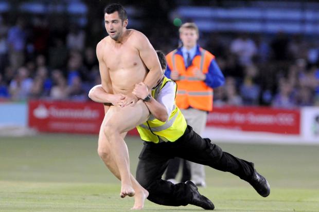This is how T20 cricket fans are kept entertained during the break in matches at Hove. Naked men are given a 10 second start to see how long they can go before being downed by the chaser.