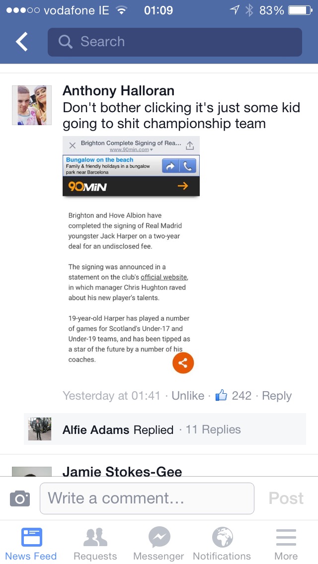 Hi All, Just having a quick browse and found a clickbait crap transfer story about the Tesco bags signing some Scottish youngster from Real Madrids youth team headlined, rather w*nkishky, as 'Real striker signs for SHOCK English club' ! Then after learning of the disappointing fact that it was said youngster to BHA rather than, say, Benzema to us saw the below in the comments section