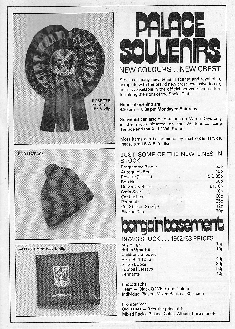 I've just read the 73-4 handbook, probably for the first time since August 1973, and there is absolutely no mention in there of our colour and crest changes. So I turned to the first few home programmes and in each of them, the inside back page carries the advert attached - but that's all there is. Bear in mind I stopped after the first 3 editions so there may be something later in the season, but that's just guesswork. Note the discrepancy in the prices of the rosettes, a typical Palace mistake! Good luck with your project, let me know if you need any more help or any photos etc.