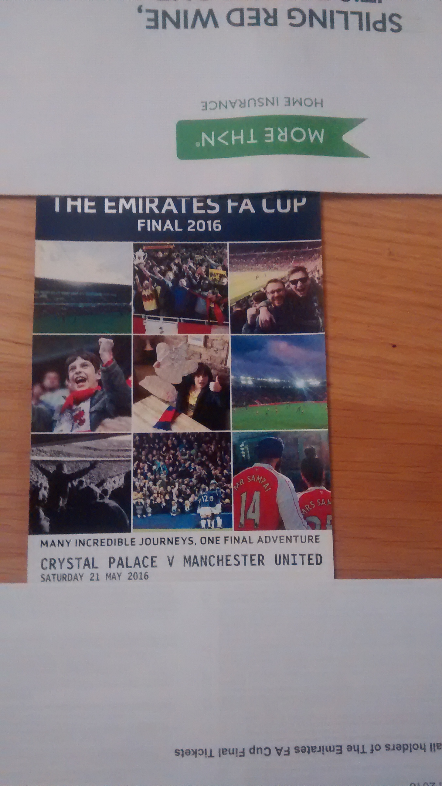 It's blue with a montage of about 9 pictures. In the middle is a palace lad with one of those home made Fa cups, pic in the bottom right corner is of 2 arse fans with Mr samrai and Mrs samrai on their shirts