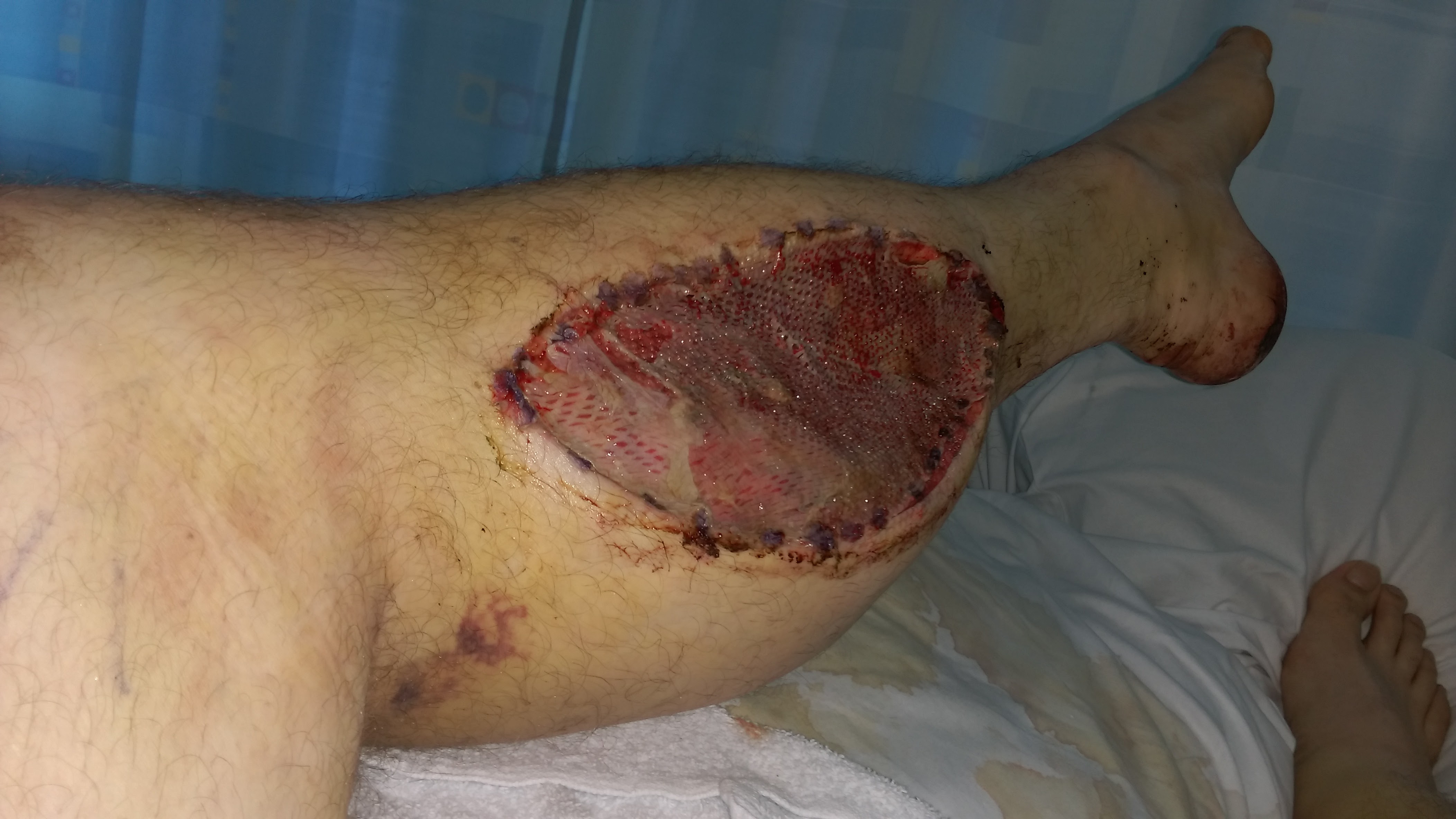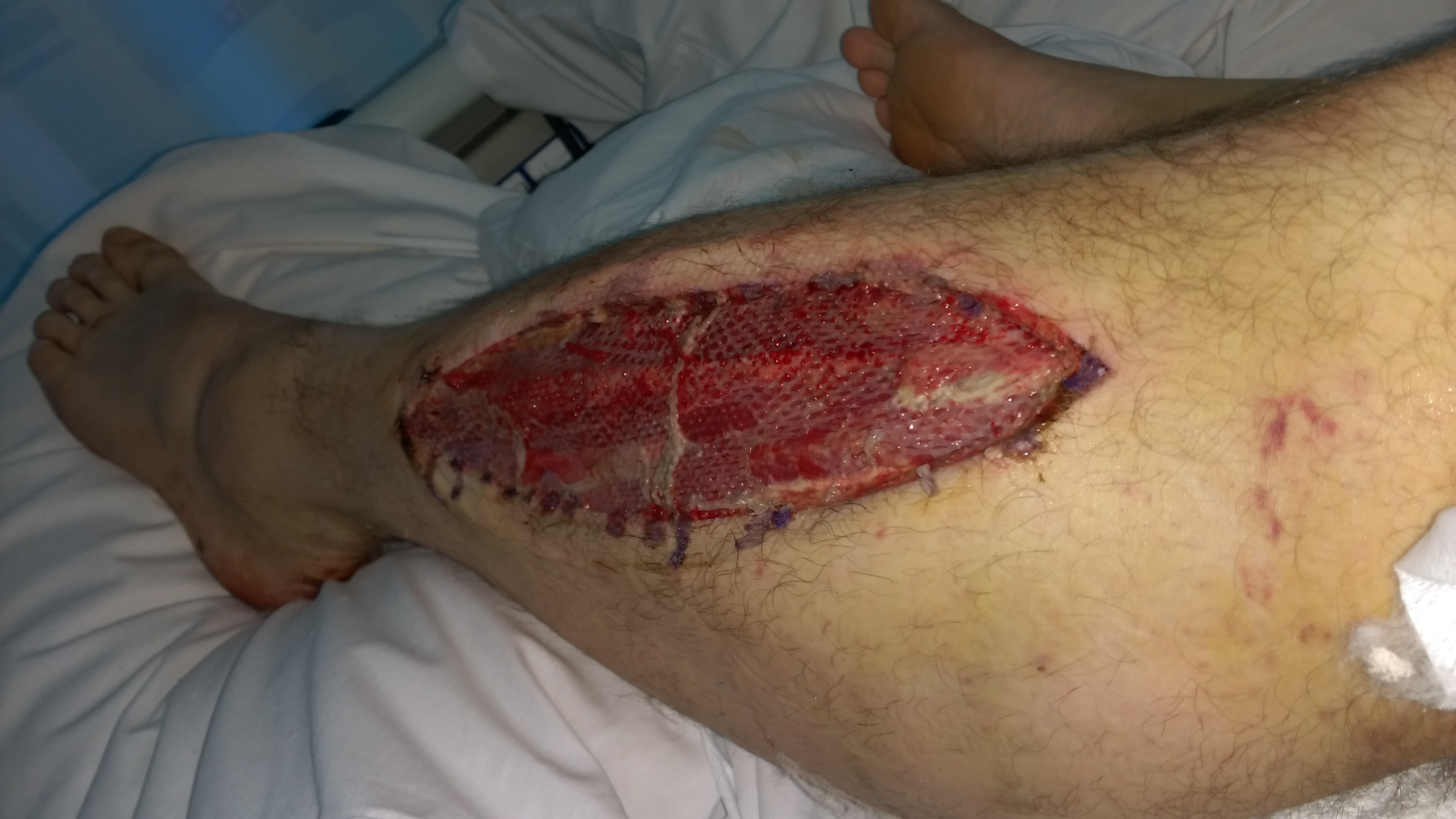 I've attached a couple of photos from after the fasciotomy and skin grafts. If you are squeamish then don't click on them.