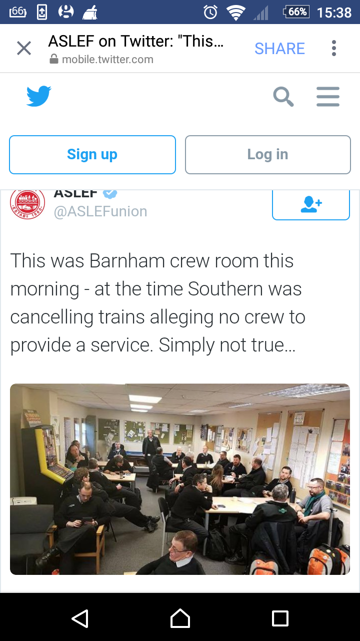 Southern lying again? Possibly or, as it's an ASLEF post, more evidence that the lazy guards haven't bothered to show for work so the drivers are sitting doing nothing because they won't accept DOO so the trains can't move without a conductor? Get rid of them and these boys could be driving.