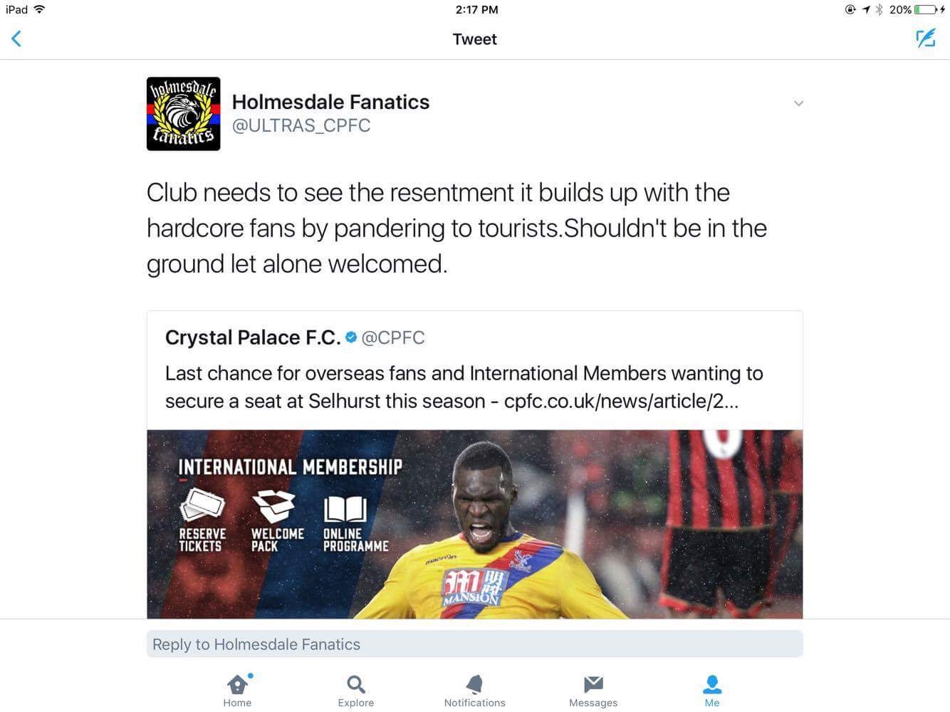 I will be honest I always admired these guys to some extent for their passion and commitment however the post they made on twitter today about international members is beyond stupid and goes to show what a limited bunch they are and how little research they have done. Yes I live away from the UK and I am so sorry they feel I am less off a fan than them because I don't walk around with banners and devote all of my weekends to Palace like they do. However what I will say is that not only in Toronto but across the world that have formed supporters groups and regularly watch the games at various venues together and sit through watching the same drivel that all of them have to put up with. So if we would like to attend a game when back in the UK they should offer us a little more respect and not come out with rubbish like this. Morons! Will be interesting to hear others thoughts on this. They are quite clearly with out a doubt talking about premiership tourists ie those who just go to any ground to watch a premiership game just coz it's a premiership game and not palace fans who live abroad or can't get to games frequently.