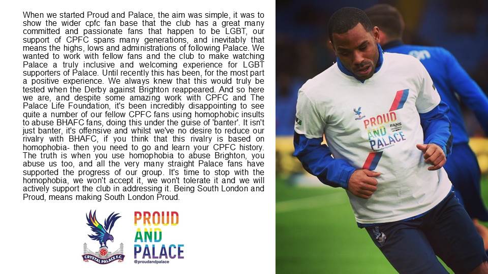 100% agree with this statement. Leaving aside the fact that homophobic abuse is wrong and should end, the fact that (assuming we survive) Palace vs. Brighton will be in the harsh glare of the Premier League next season means that any abusive songs are going to get a lot more attention than they have in the past.