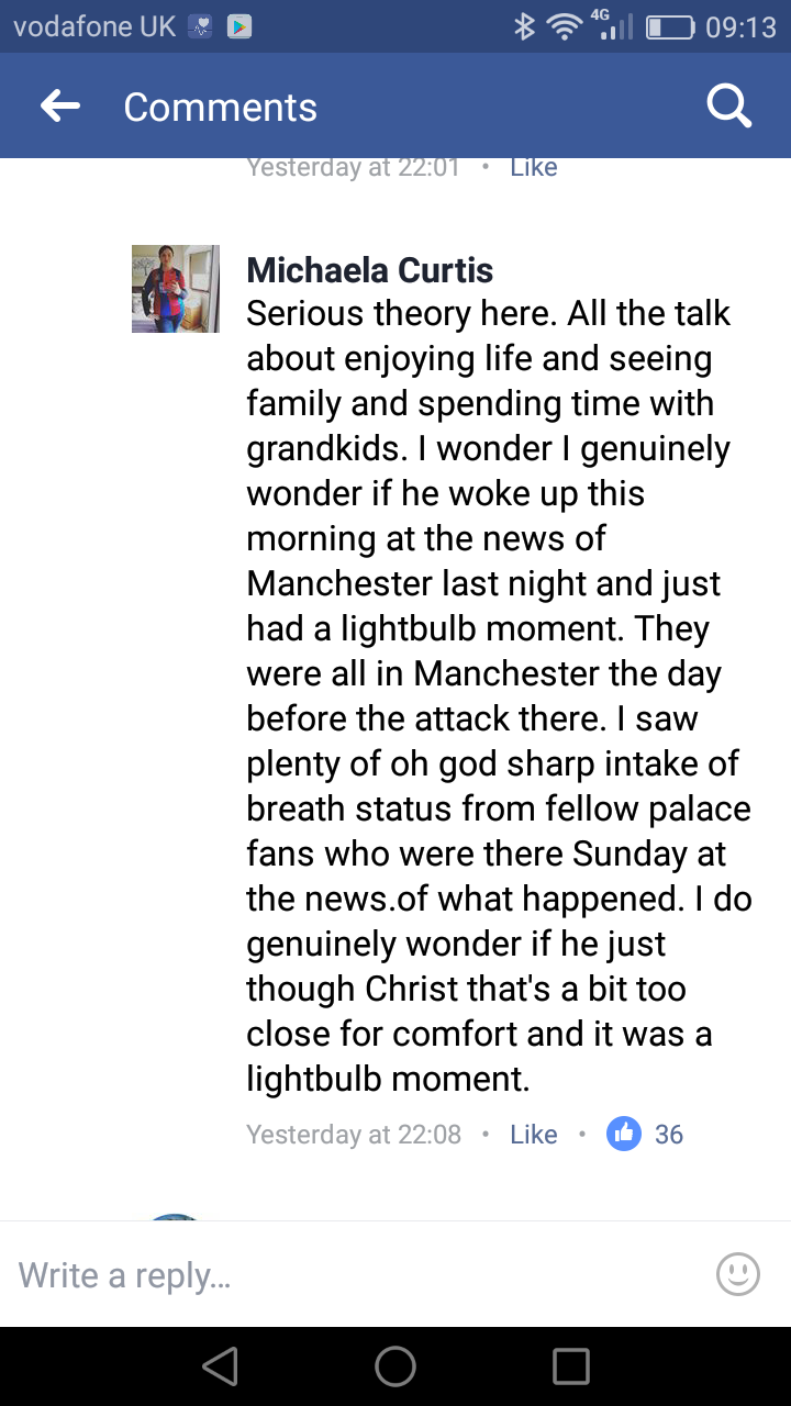 I'm not, for one moment, suggesting that there isn't something in this, but this story has escalated from the Manchester atrocity got Sam thinking about families and mortality in general, to he knew someone involved to he lost a close friend. Perhaps, unless there's any confirmation of these stories, for the sake of all those who were involved, we should stop hanging the departure of a football manager on an act of terrorism. True, but by putting this "possible" information out there, it might stop some angry Palace fans hanging Sam out to dry for leaving us for selfish reasons , and feeling awkward at a later date if this turns out to be true. Edited by hastingseagle67 (24 May 2017 9.45am)