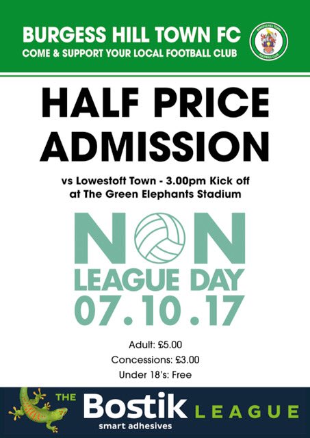 Also half price to get into Burgess Hill Town vs Lowestoft. Edited by Part Time James (05 Oct 2017 1.56pm)