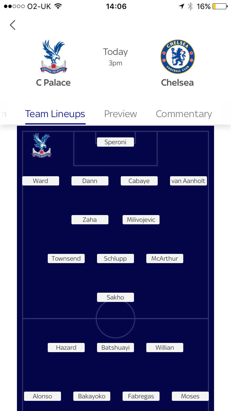 Chelsea recent league form: WWWDWL Our recent league results vs Chelsea: LLWLLW TEAMS: Palace: Speroni, Ward, Dann, Sakho, Schlupp, van Aanholt, Milivojevic, Cabaye, McArthur, Townsend, Zaha Subs: Henry, Tomkins, Fosu-Mensah, Kaikai, Sako, Puncheon, Riedewald Chelsea: Courtois, Alonso, Cahill, Luiz, Azpilicueta, Moses, Fabregas, Willian, Bakayoko, Hazard, Batshuayi Subs: Caballero, Rudiger, Pedro, Musonda, Zappacosta, Christensen, Scott