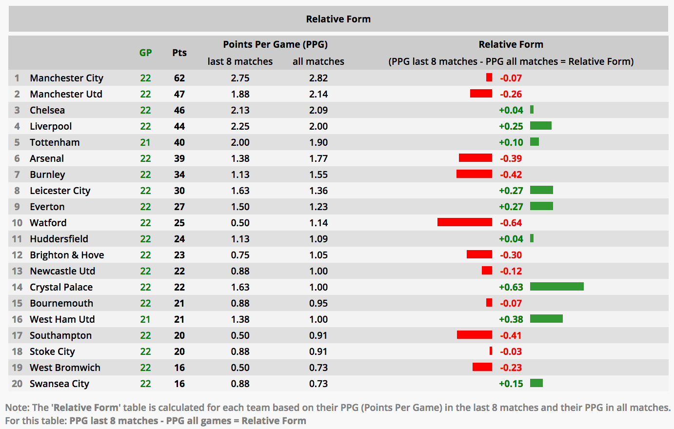 Our form is dramatically different, which is visible with the naked eye as well as with a calculator. What I didn't realise though, was just how bad West Brom have been. They won the first two games of this season but, if you take their 9-game winless streak to end last season, that's 2 wins in 31 games. That's Derby form. This followed them being the 5th largest net spender in the off-season, so it's not like they aren't trying. We are still very much in the relegation mix - in reality everyone up to 10th (at least) is - but with the likes of West Brom, Swansea, Southampton and Stoke all cratering right now, the rest of us have a real opportunity to make it a 4-team mini-league for the drop.