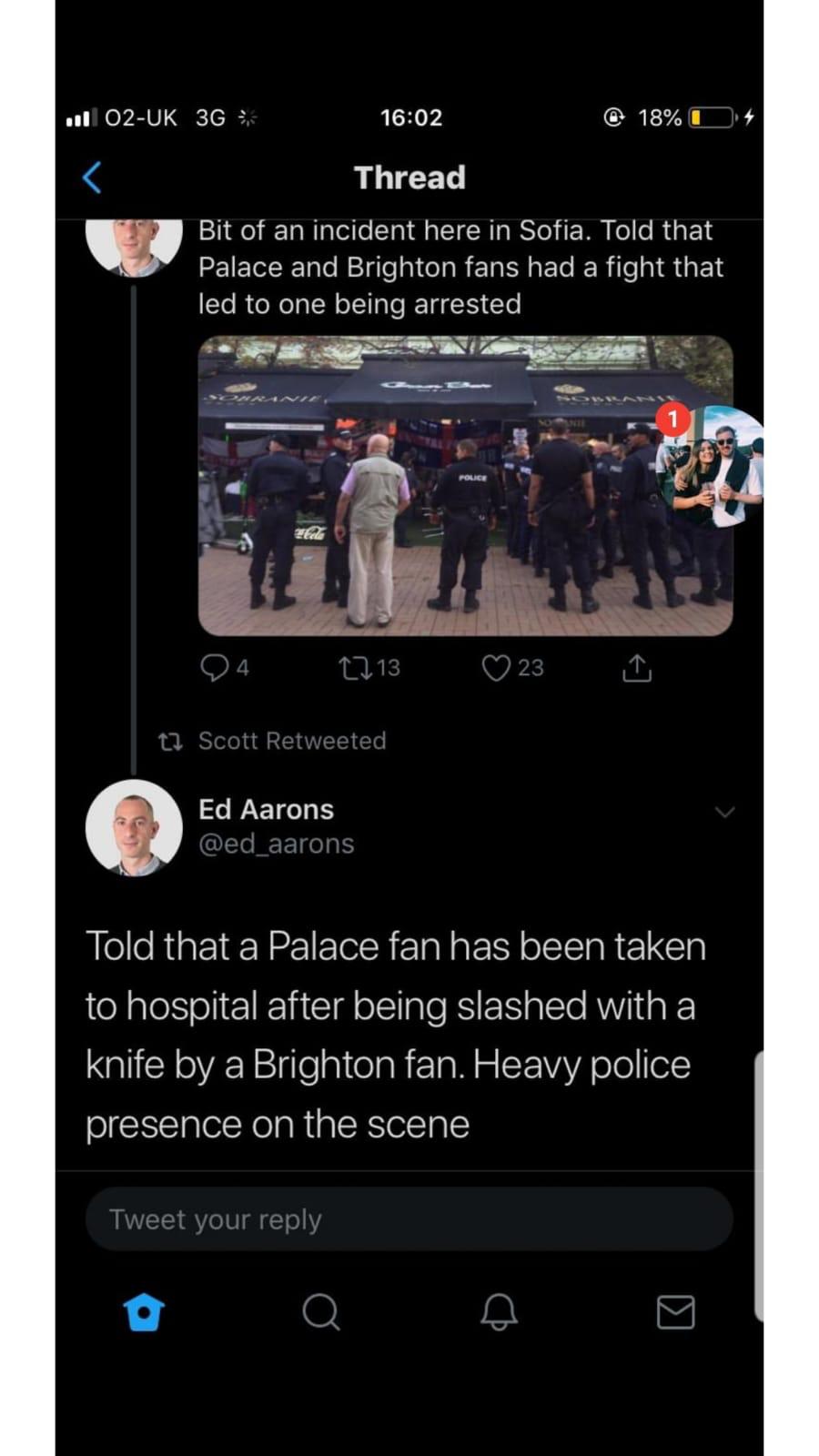 A load of trouble after a big group of Brighton attacked a few Palace fans out there, apparently a load of Charlton and Bolton backed the Palace lads up but 1 Palace supporter in hospital after having his face slashed Jesus, that's a bit out of left field!