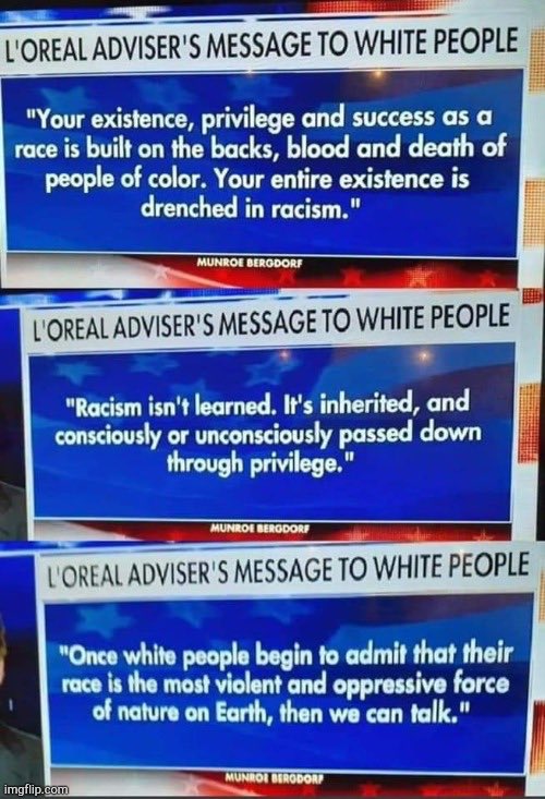 This is taken out of context and intended to aggravate tensions. This person is not really an advisor but a model. All the quotes were taken from 1 facebook post published in 2017 shortly after the Unite the right rallies in Charlotsville, America where a left wing protestor was killed by a member of the right wing. She was sacked from L'oreal shortly after the posts were made public. Wikipedia entry on the story: The scary thing is that people can and will believe what has been said and such rhetoric can be used to inflame tensions and create further division between people. Some people want that to happen but it just creates an unsafer society for all.