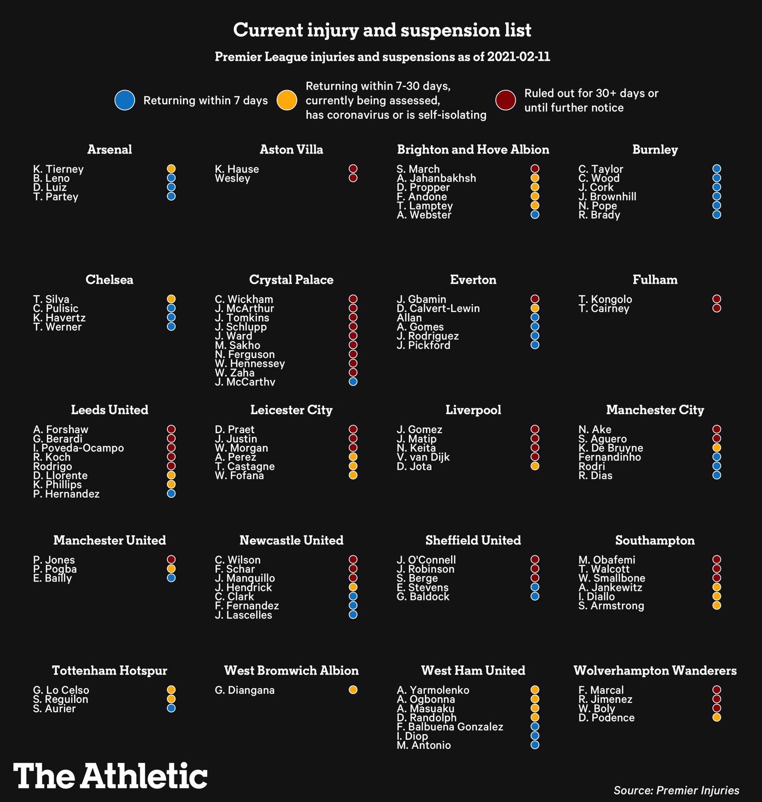 It states those marked with a red dot are either 30+ days away from return or return date is unknown. Roy has certainly not stated an expected return date. As doombear said it does put the Scouse pundits' whining into perspective. When we play it is barely mentioned that we are having a proper injury crisis.