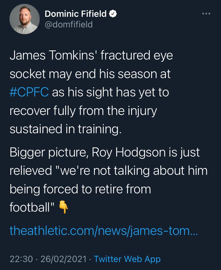 Reading between the lines it is unlikely he will play again this season as he is not even allowed to do fitness training whilst he waits for the eye to heal, so even after he is 100% he will then have weeks of training before he is back to playing fitness. Big loss as he is our best centre half by some distance.