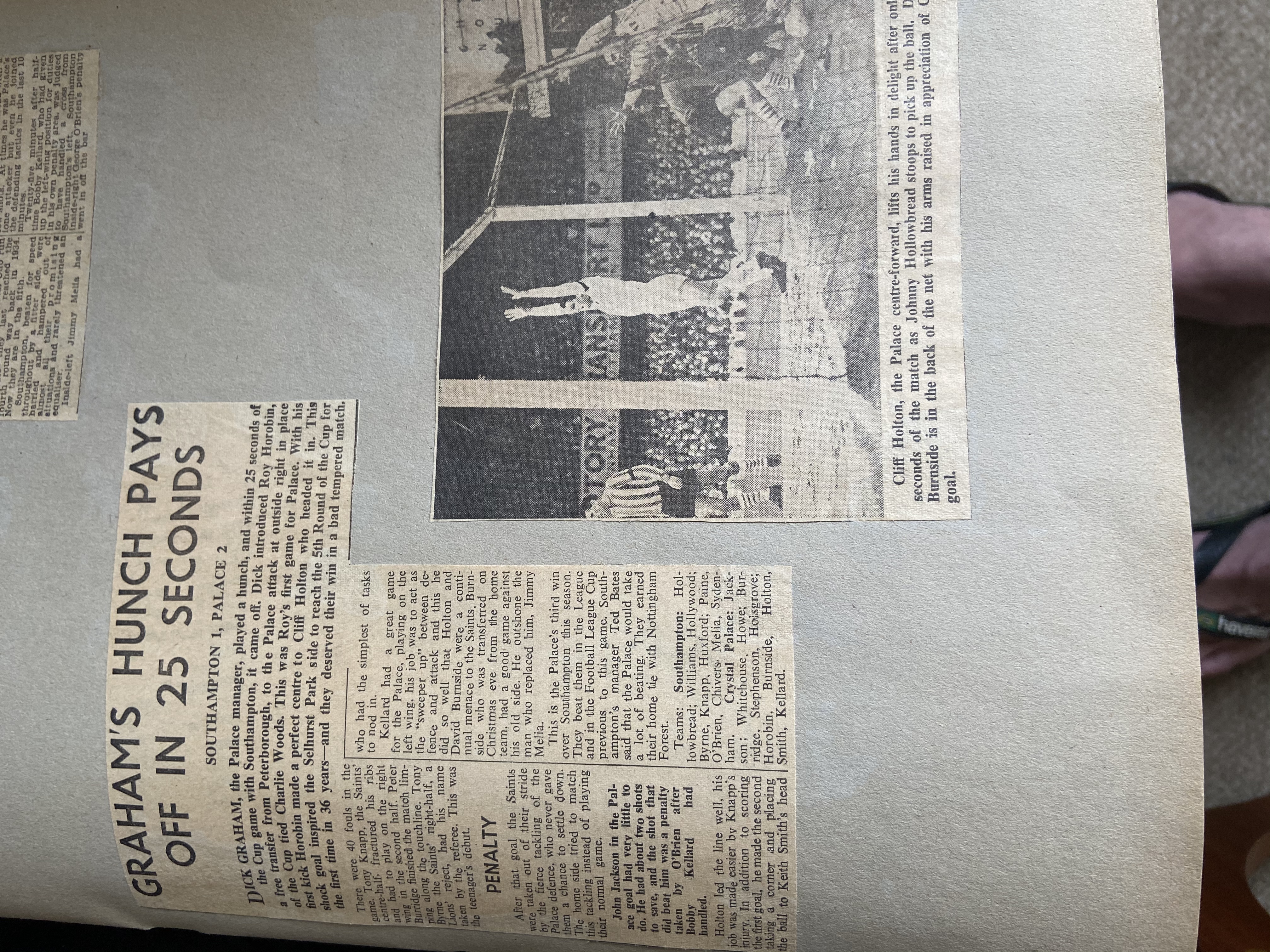 I wonder whether any readers were at the match described below. Even if not, the description might provide a break from the interminable, tedious and sterile thread about our non-manager. That winter I was based in Scotland, and a good friend was so impressed by our 4th round win at Southampton that he put pen to paper the following day. During another pandemic clear-out I came across his letter. He wrote: "Palace had 70% of the play and might have had 4 or 5 goals. They played good open football and I've never seen them better. It was a pity that the general standard of play deteriorated in the second half. It was foul-a-minute stuff with each side equally to blame. On the Palace side the main offender was Burnside, and believe it or not, throughout the match Bert Howe didn't commit a single foul, perhaps because he was playing right back" (i.e., not his normal side). "Peter Burridge was great as a wing half, but Horobin must be about the most useless forward since Uphill. His first centre to Holton was great, but after that he faded. Our second goal was terrific. Cliff took a corner on the right and hit it as hard as he normally shoots. The ball was still rising on the far side of the goal when Smith headed it in. Even the Saints supporters admitted that they had never seen a corner like that. Bobby Kellard had a great game, but it was a pity he handled the ball unnecessarily to give away a penalty. Still, we won - now for Spurs, Chelsea or Manchester United at home." (We beat Nottm. Forest at home in the 5th round, then went out to Leeds.)