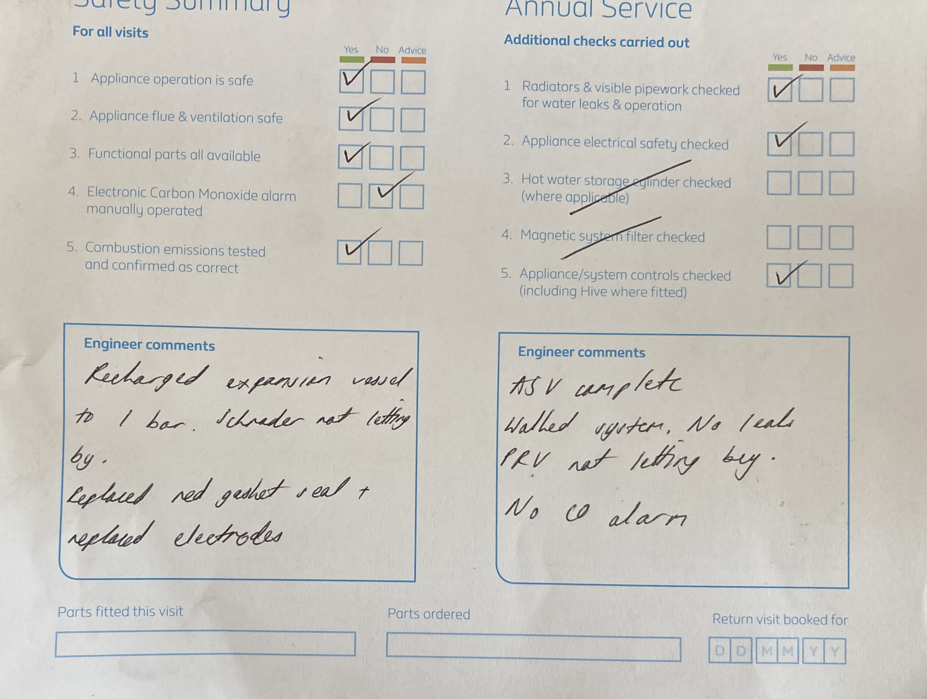 Get the expansion vessel checked rudi. Edited by cryrst (26 Jul 2021 11.31pm) Had them back before cancelling, after making sure it’s ok again. He said it was last serviced last year. So the service this year wasn’t logged and he probably didn’t do anything at all. Today I checked him taking parts off and seeing to various things. Do these engineer comments look like enough?