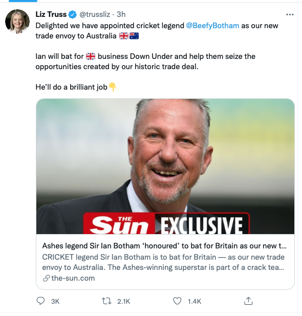 Didn't work for Hancock so don't buy into that premise too much He was endorsed by Bojo 48 hours before media really went for the jugular with further revelations that fatally broke Hancock's family survival and crashed all credibility of previous assurances to the Electorate. Bojo's judgement came under severe scrutiny post Hancock resignation yet repeated PM behaviour on display of attempting to brush all scandals under the carpet with mantra that a week is a long time in politics - basically the half-arsed electorate will quickly forget. Today's dead cat strategy of Liz Truss appointing Ian Botham as The Govt's choice of trade envoy to Australia is a way of keeping Afghanistan; Covid etc off the front pages.