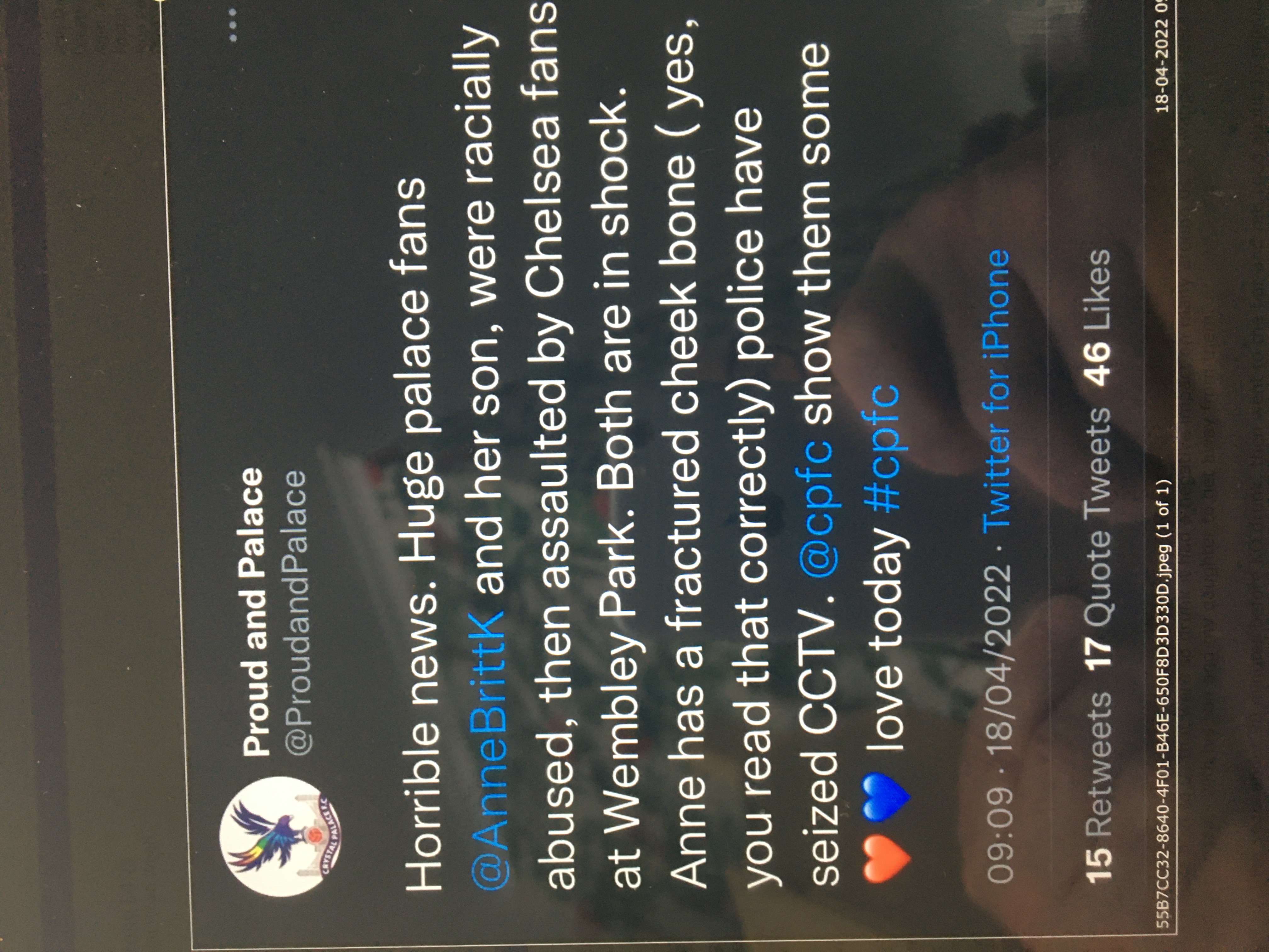We’re not totally innocent on the scum front, I saw a palace fan try to jam the end of his flag in a Chelsea fans face who’s only crime was to drift over our side along Wembley way Virtually every club has a minority of scumbags, some just look for trouble, others let the drink take over and get aggressive. Hope the mum recovers very soon, and also hope her son gets over what happened.