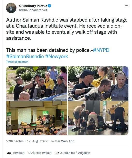 I do understand your motive for writing that Matov, I really do but it has rendered me such contempt for the MSM that it no longer really bothers me. My guess would be a person identified as 'Muslim' whatever the skin colour but although it won't be reported I am guessing the secondary cause is that it is someone who probably does have some mental health problems, most definitely caused or exacerbated by a miserable life, most likely the result of their own failings, causing anger and lack of spiritual fulfillment which they are trying to salvage through perversion of ancient literature (or religion as some call it). My primary assumption however is somewhat racist in that I am inclined to believe it has happened as a result of the good ol' US and A!! The greatest country in the world!! So great in fact that it is home to the extremes of military power, wealth, glamour, movie industry and of course lunatics on the extreme fringes of their society however we don't balance that in the equation for what constitutes 'the greatest country in the world'. Place is a circus. Happy to be disagreed with as always. If it is a Muslim then they attempted to kill Rushdie because those are the rules. Hence why he usually has very good security around him. That simple. People try and make it all complex without actually understanding what the rules of Islam actually are. To be fair, Islam is truly a very simple religion to adhere to. Makes all kinds of things very very clear. There are no nuances to it. Just the basic reality of what the punishments are for things such as apostasy, insulting their Prophet, Homosexuality and so on. It is only Western Soc.libs who try and down-play it.